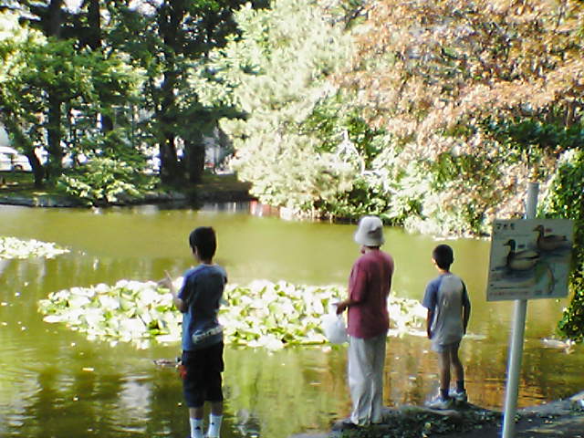 食べ終わって池の周りで小さい魚やマガモとハトとコイを見てました。