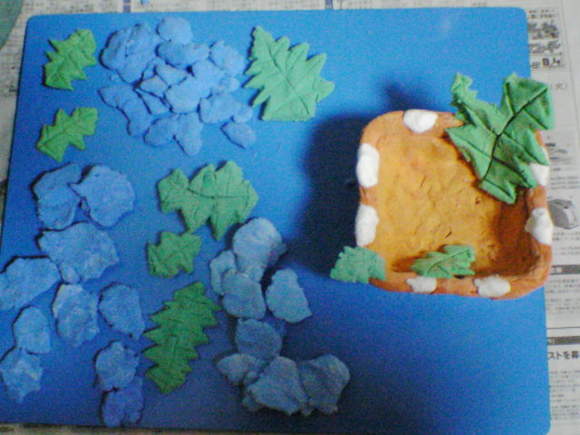 白い紙粘土に絵の具を混ぜて、葉っぱと花びらを作っています。